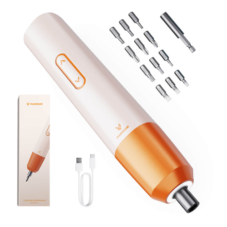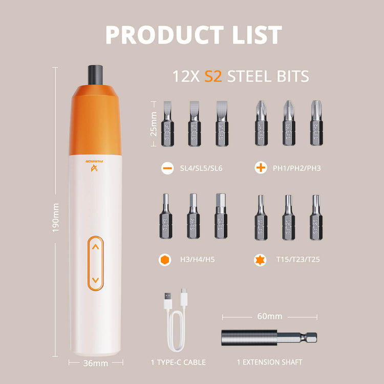 The package includes 1 * 4V rechargeable screwdriver, 12 * 6.35 x 25mm bits (Phillips: PH1/PH2/PH3; Hexagon: H3/H4/H5; Torx: T15/T20/T25; Slotted: SL4, SL5, SL6), 1 * 60mm extension shaft, and 1 * Type-C cable.